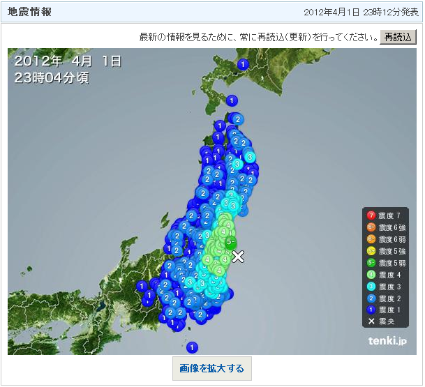 発生時刻 2012年4月1日 23時4分頃 震源地 福島県沖 最大震度 震度5弱 位置 緯度 北緯 37.1度 経度 東経 141.3度 震源 マグニチュード M5.9 深さ 約50km 震度5弱 福島県 楢葉町富岡町 以上